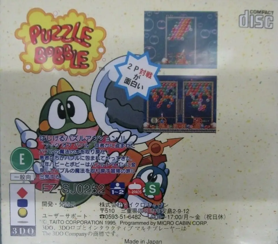 Puzzle Bobble (パズルボブル, Pazuru Boburu), also known as Bust-A-Move, is an arcade game developed by Taito. It is the first game in the Puzzle Bobble (series). Puzzle Bobble is a puzzle spin-off of the Bubble Bobble series. The game is a tile-matching puzzle game, in which Bub and Bob must shoot bubbles into pairs of three.