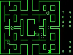 Atom Man is a Pac-Man clone that makes few changes to the arcade original. The player has to collect all the dots in the maze without being caught by the ghosts (or atom men as they are called here) that are chasing him. Some dots are larger and when collected the roles are reversed as they allow the player to go after and eat the ghosts. A level is completed when all dots have been collected. This version does not have any fruit. Instead there's a Hopesoft logo that can be picked up for a large points reward. The player has three lives and another one is given when 10,000 points have been scored. Before a game the player can choose one of three skill levels.