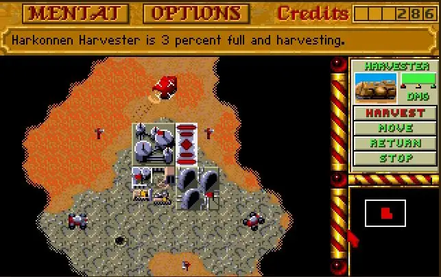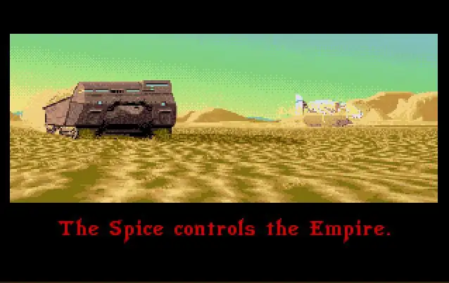 The single resource in the game is the Spice, which must be collected by harvesters. The spice is converted to credits in a refinery, which are then spent to construct additional buildings and units. There are two terrain types: buildings can only be constructed on stone, while the Spice is only found on sand. However, units moving on sand attract the large sandworms of Dune, who are virtually indestructible and can swallow even large units whole. As levels progress, new and more advanced buildings and units are made available, including structures like a radar station, a repair facility or defense turrets and, for units, various ground troops, light vehicles and tanks. Each House can construct one unique special unit, and, after building a palace improvement, can unleash a unique palace effect.