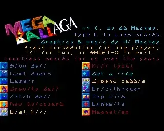 Megaball is a legendary arkanoid/breakout clone for the Amiga created by Ed Mackey (with his brother Al) and released initially in 1990 as shareware. Since then, the game got several updates, until version 4.0 AGA published in 1995. In 2012 the author decided to release the game as open source software.