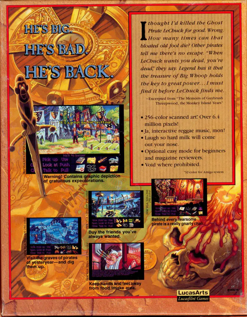 Guybrush Threepwood, the mighty pirate who can hold his breath for ten minutes, could have lived quietly and happily with his sweetheart Elaine, the governor of Melee Island. But the restless pirate spirit won’t let Guybrush in peace. Things don’t go very well with Elaine, and Guybrush (now with a beard) embarks on a new adventure: searching for the legendary treasure of Big Whoop. However, the evil ghost pirate LeChuck hasn’t left the stage yet. His subordinates are trying to bring him back from the dead one more time. Will Guybrush be able to defeat his archenemy again?