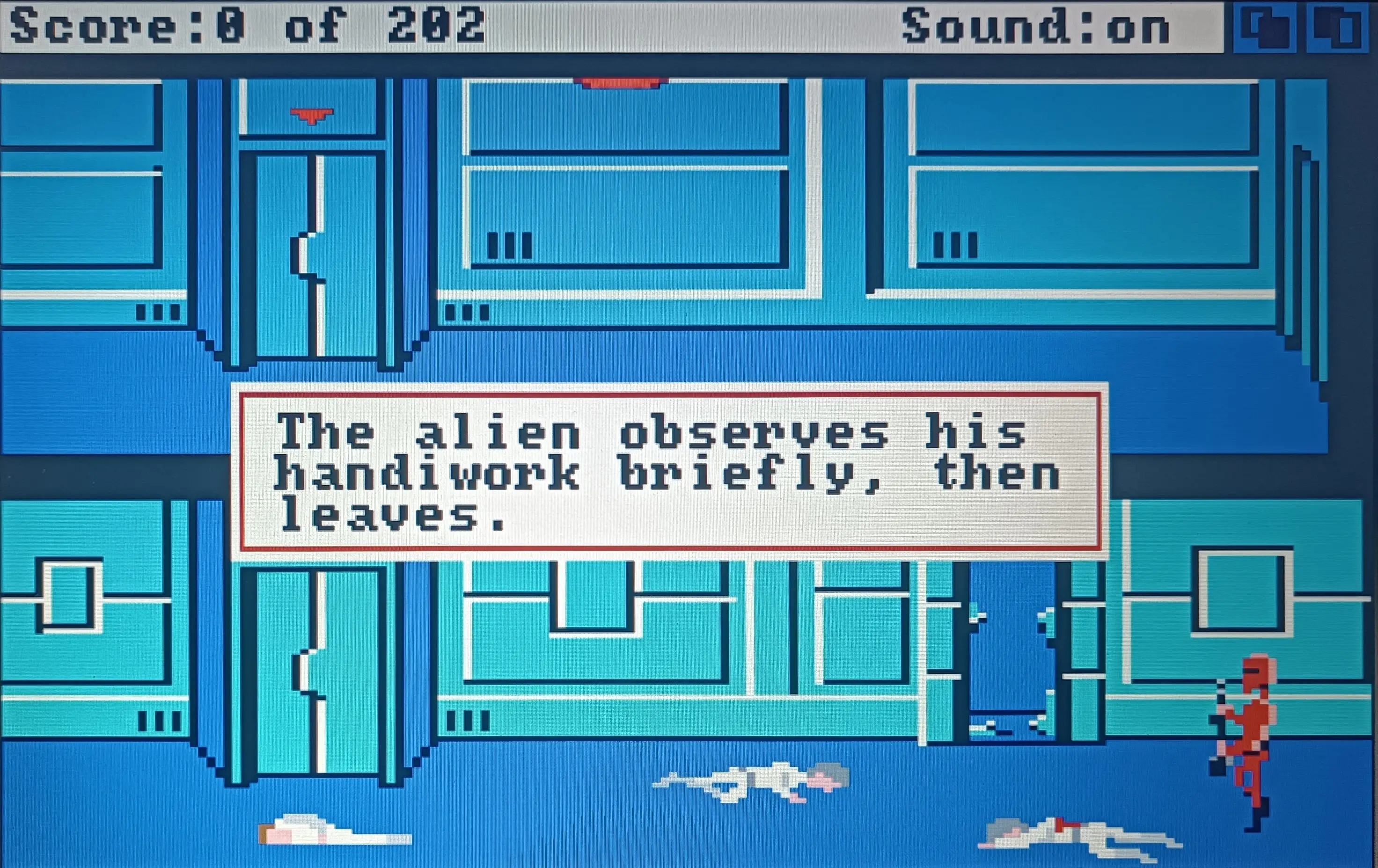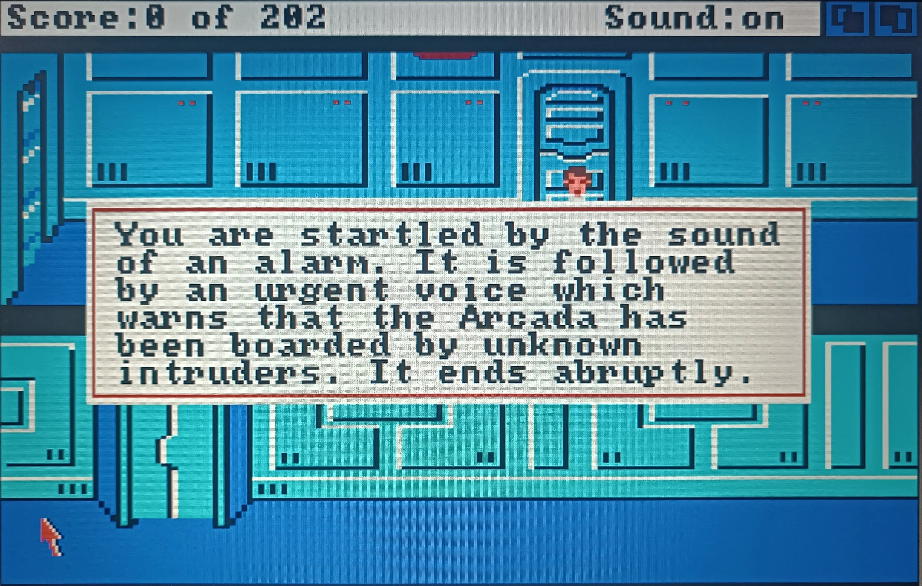 Within the Earnon galaxy, Roger Wilco, a janitor aboard the scientific spaceship Arcada, awakens from an on-duty nap in his broom closet to find that the ship has been boarded and seized by the sinister Sariens. He soon learns that they have stolen a powerful experimental device called the Star Generator, which could cause untold disaster in their hands. Acquiring a keycard from a dead crew member's body, Roger flees the ship in an escape pod. Moments later, the Arcada self-destructs.