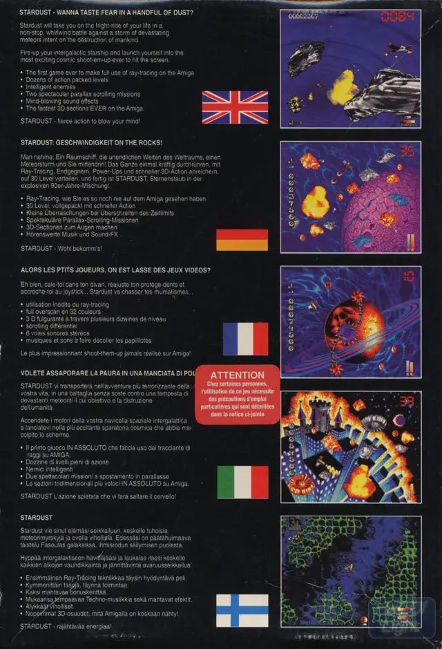 Stardust is basically Asteroids, but with a lot of gameplay modifications. There are 30 standard levels split into 5 worlds. The 6 levels a world is made of can be completed in any order. However, you must fight an end-of-level bad guy once you have finished the 6th level of a world. While each level has the standard disintegrating rocks to destroy, all but 2 of them have extra bad guys, with a range of attack patterns.