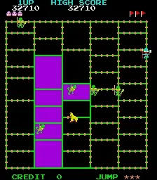 Whenever a rectangular portion of the board is cleared (either by collecting all surrounding coconuts, or painting all surrounding edges), the rectangle is colored in, and in the even levels, bonus points are awarded (In odd-numbered levels, the player collects points for each coconut eaten). When the player clears all four corners of the board, he is briefly empowered to kill the enemies by touching them (just as when Pac-Man uses a “power pill”). Enemies killed in this way fall to the bottom of the screen and revitalize themselves after a few moments.
