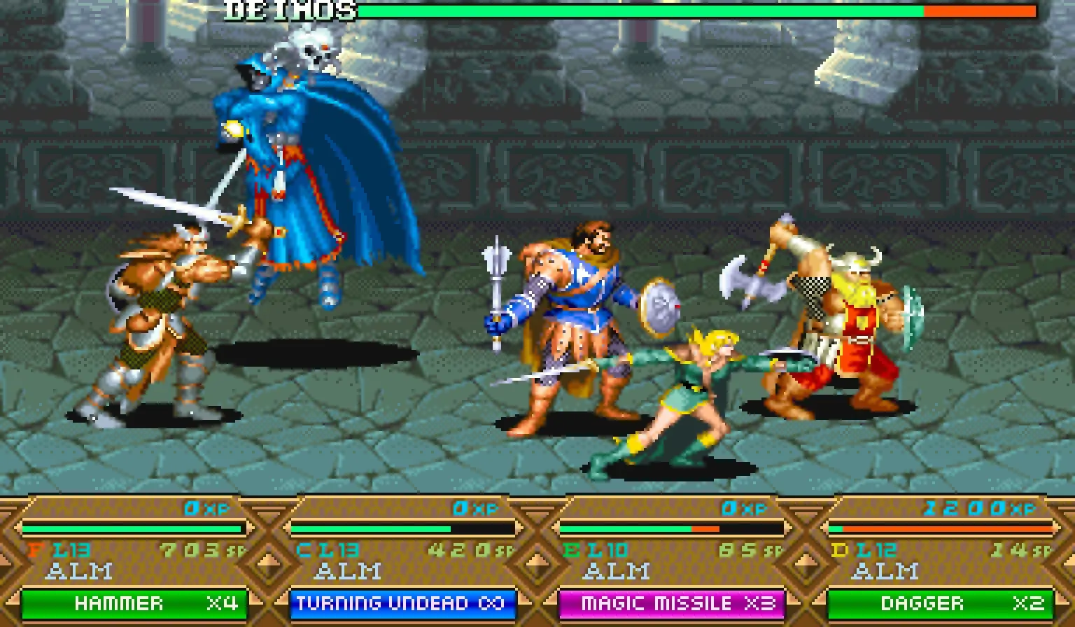Tower of Doom is a side-scrolling arcade game featuring four different characters (cleric, dwarf, elf, fighter) fighting iconic Dungeons & Dragons monsters. Bosses include a troll that regenerates unless burned, a large black dragon, the dreaded Shadow Elf (Mystara’s equivalent of the drow), a beholder, the optional superboss Flamewing (a great wyrm red dragon) and the final boss Deimos (an archlich).