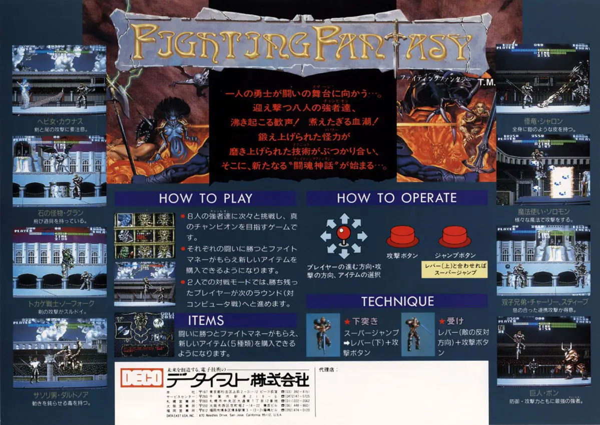 Other machines made by Data East during the time period Fighting Fantasy was produced include Avengers, The, Act-Fancer: Cybernetick Hyper Weapon, Kuhga – Operation Code ‘Vapor Trail’, Hippodrome, Vapor Trail – Hyper Offence Formation, Cobra Command 1988, Birdie Try, Time Machine, Dragon Ninja, and Bad Dudes Vs. Dragon Ninja.