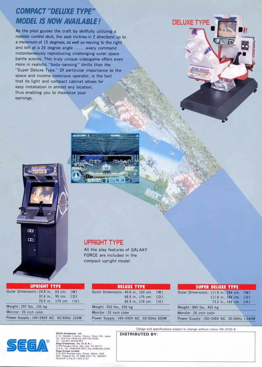 Galaxy Force is a sprite-scaling rail shooter arcade game, released by Sega in 1988 and built upon the Sega Y Board. The game is in the tradition of Sega’s Space Harrier series. The game was ported to numerous consoles including the Sega Master System, the Atari ST, the Sega Saturn, and the Playstation 2.