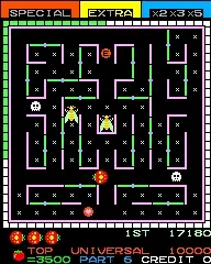 At each level, the maze will contain three letters. The first will be randomly selected from the set of {X, T, R} (which appear only in EXTRA), the second will be randomly selected from the set of {S, P, C, I, L} (which appear only in SPECIAL), and the third will be an A or an E (which appear in both words). A secondary goal of the player is to complete the words SPECIAL (indicated in red in the top left corner) and EXTRA (in yellow at top center). If, for example, a letter S is consumed while it is red, the corresponding letter in the word SPECIAL will change from grey to red. Eating an S while it is any other color (or if the S in SPECIAL is already red) offers no benefit beyond the points collected. Completing the word SPECIAL rewards the player with a free game, while completing EXTRA gives the player an extra life. Completing either word causes all its letters to return to normal and immediately advances the player to the next level.
