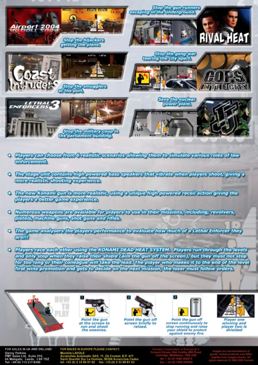 Lethal Enforcers 3 is a light gun game for one or two players, and it is the final in the Lethal Enforcers series. The game uses 3D polygon graphics instead of digitised actors.