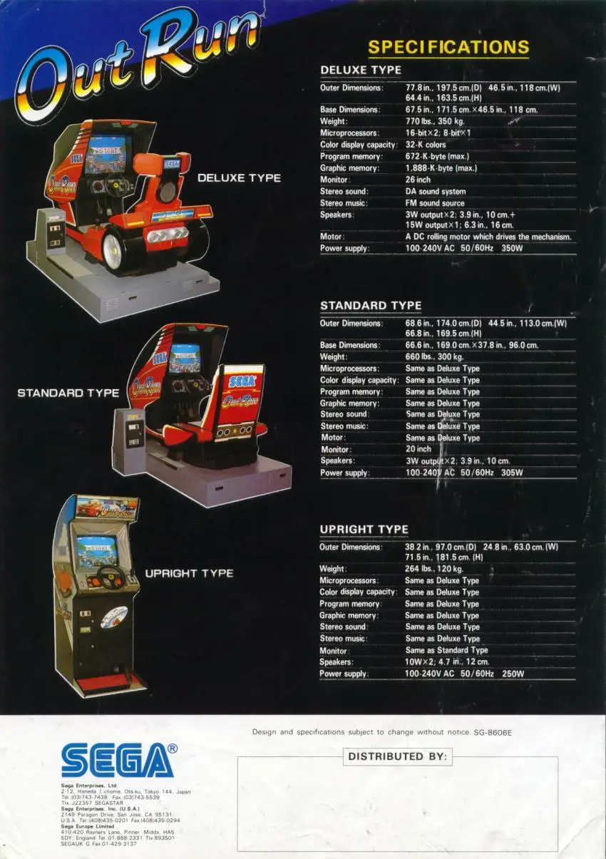 Out Run is an arcade game released by Sega in 1986. It was designed by Yu Suzuki and developed by Sega AM2. The game was a critical and commercial success, becoming one of the best-selling video games of its time. It is notable for its pioneering hardware, graphics and music, and innovative features such as a selectable soundtrack and nonlinear gameplay.