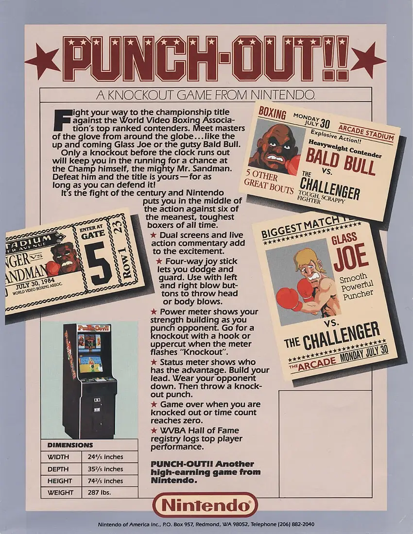 Punch-Out!! is a 1984 arcade video game developed by Nintendo R&D3 and released by Nintendo of America in the USA on February 17, 1984.
