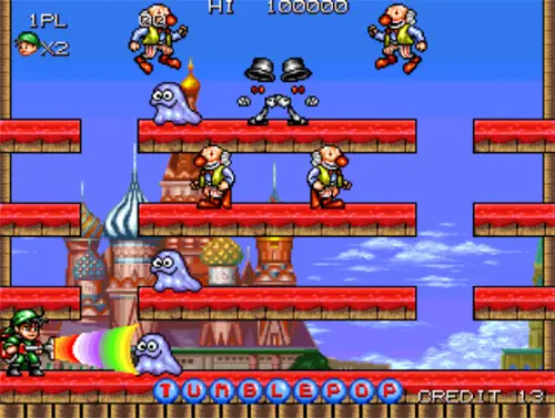 The game involves one or two ghost-busters who can suck monsters, ghosts, aliens and various other oddball characters into vacuum-cleaner-like devices and spit them back as bouncing/rolling balls. Expelled enemies function as projectiles that can damage and kill other opponents on the screen when colliding with them. The game’s looks are reminiscent of Pang. Throughout the game, the player/s can collect letters of the alphabet found in randomly appearing bubbles in order to gradually spell the word “TUMBLEPOP”, the progress of which is permanently displayed at the bottom of the screen. When completed, players are transported to a bonus level which gives them the opportunity to obtain higher scores and an extra life, although this level is strictly timed. The word goes back to default after completion.