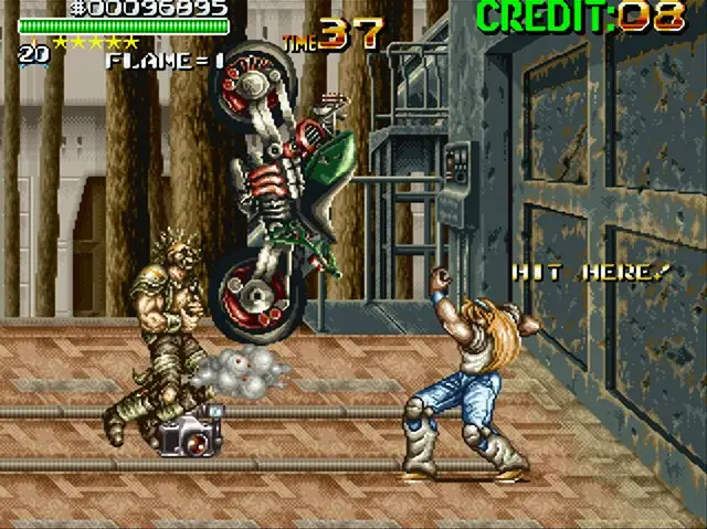 Dr. Clayborn and his henchmen have taken control of the city! Commissioner Gordon (no, Batman is not in the game) makes one last plea for help and calls three of New York’s Finest undercover cops : Bubba, an ex-professional football player; Flame, a former Miss America; and Claude, a retired philosophy teacher. They must fight every lackey and vanquish Dr. Clayborn in order to restore law and order to the city. Very fun beat ’em up where almost anything can be used as a weapon; fish, rocks, i-beams, cars, etc.