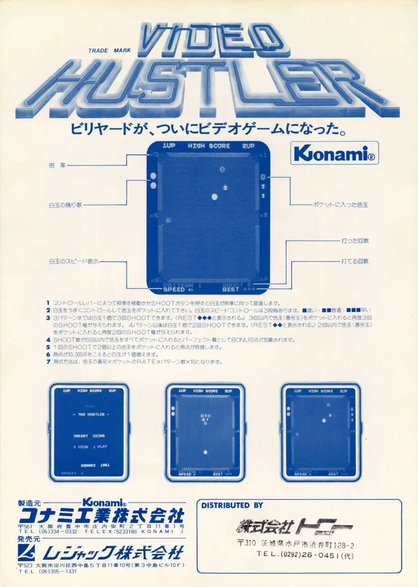 Video Hustler is a 1981 arcade video game developed and released by Konami in Japan on August 1, 1981.