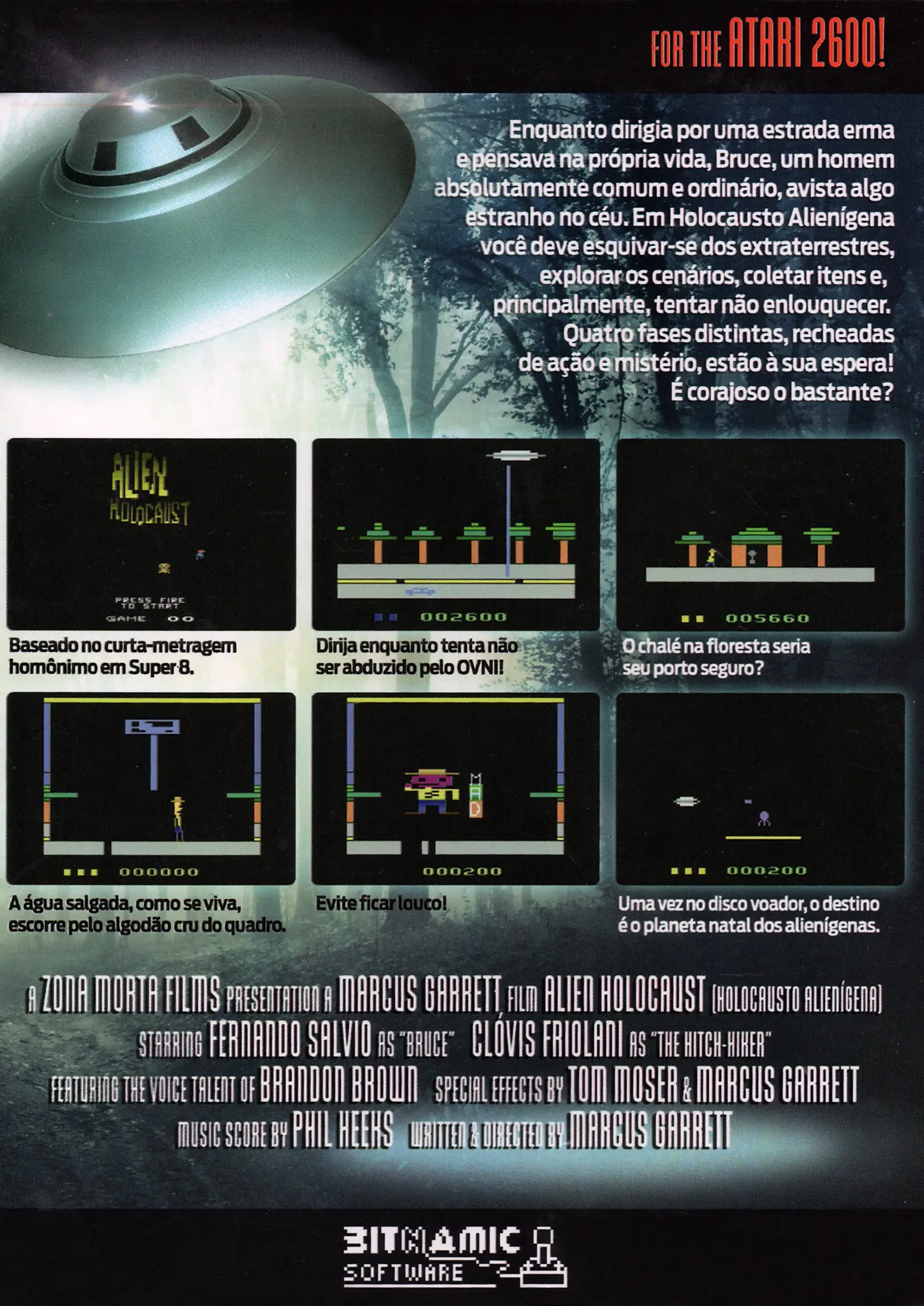 Em Holocausto Alienígena você controla Bruce, que esta sendo perseguido por extraterrestres. São 4 fases distintas com jogabilidade diferente em cada.