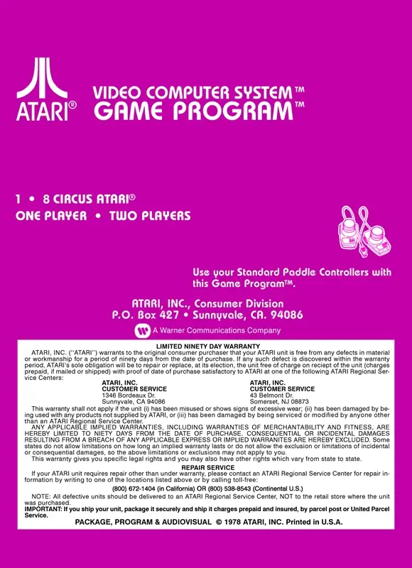 Circus Atari is a 1980 Atari 2600 video game developed and released by Atari in the USA on July 20, 1980.