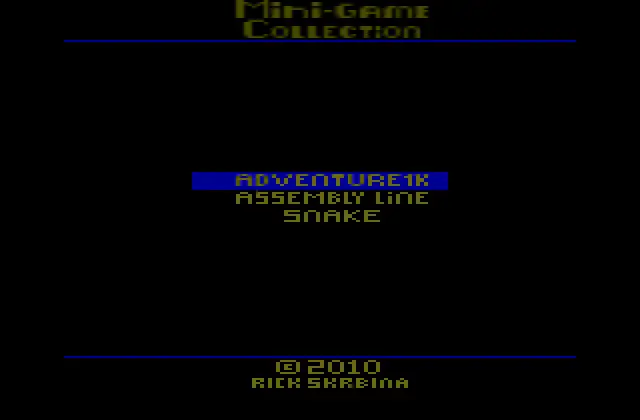Mini Game Collection is a Collection of 3 Mini-Games written by Rick Skrbina: Adventure 1K, Assembly Line & Snake.