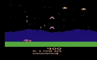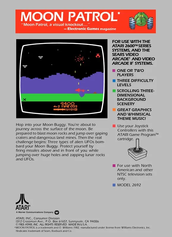 Hop into your Moon Buggy. You're about to journey across the surface of the moon. Be prepared to blast moon rocks and jump over gaping craters and dangerous land mines. Then, the real challenge begins. Three types of alien UFOs bombard your Moon Buggy. Protect yourself by firing missiles above and in front of you while jumping over huge holes and zapping lunar rocks and UFOs.