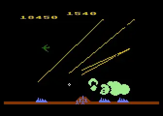 The game is played by moving a crosshair across the sky background and launch a counter-missile from the appropriate battery. Counter-missiles explode upon reaching the crosshair, leaving a fireball that persists for several seconds and destroys any enemy missiles that enter it. There are three batteries, each with ten missiles; a missile battery becomes useless when all its missiles are fired, or if the battery is destroyed by enemy fire. The missiles of the central battery fly to their targets at much greater speed; only these missiles can effectively kill a smart bomb at a distance.