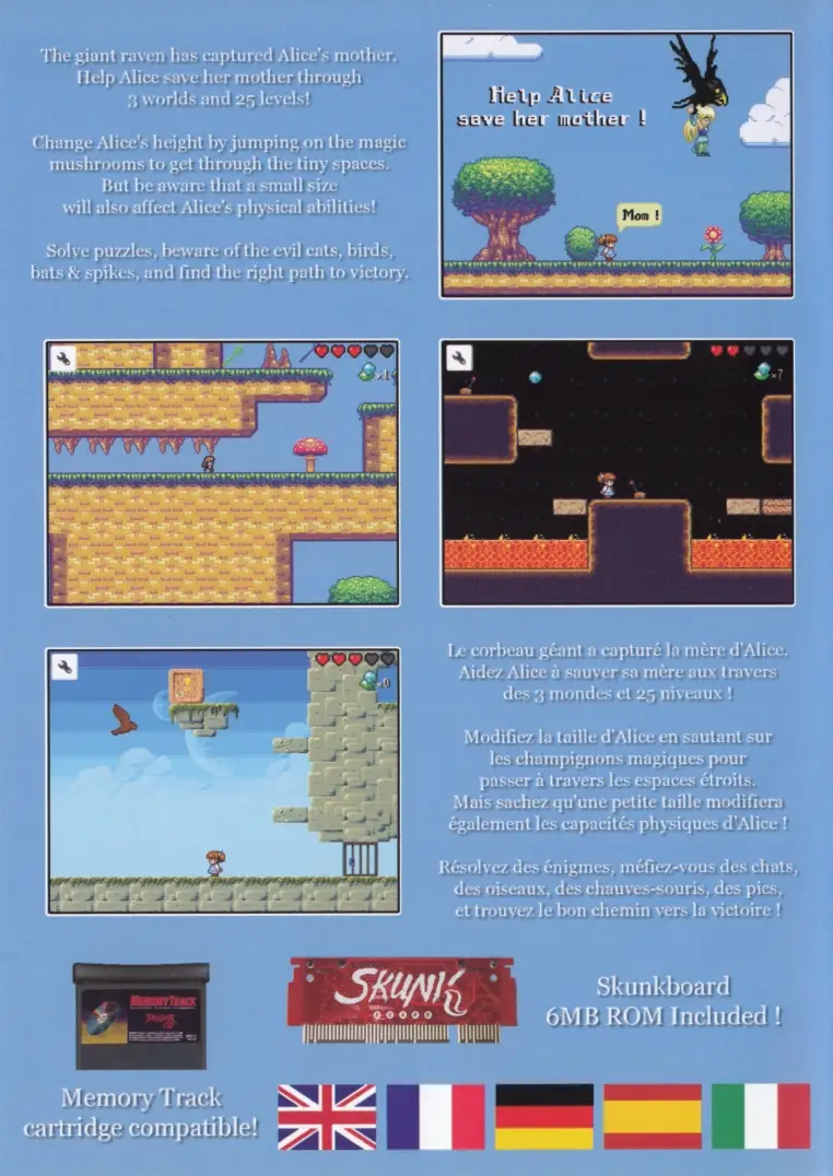 The game features three different worlds with several levels each. Your goal is to reach the exit of the level while avoiding enemy creatures (which can't be killed, and will reduce Alice's hearts — the game's life meter — by one on each contact) or harsh environments (spikes, water or lava, all instantly fatal). In the whole game you deal with locked gates and have to find the matching keys; later worlds will introduce falling platforms that disappear, levers to push in order to open the exit and movable crates that can help Alice reach certain areas. There are two types of mushrooms: one shrinks Alice, the other returns her to the normal size. Mini-Alice can access narrow passageways, but she lacks the force to push crates and her jumps are reduced in height and length. There is no game over, the current level is played from the beginning in case of failure; when starting a new game, it is possible to play from the last stage you previously reached.