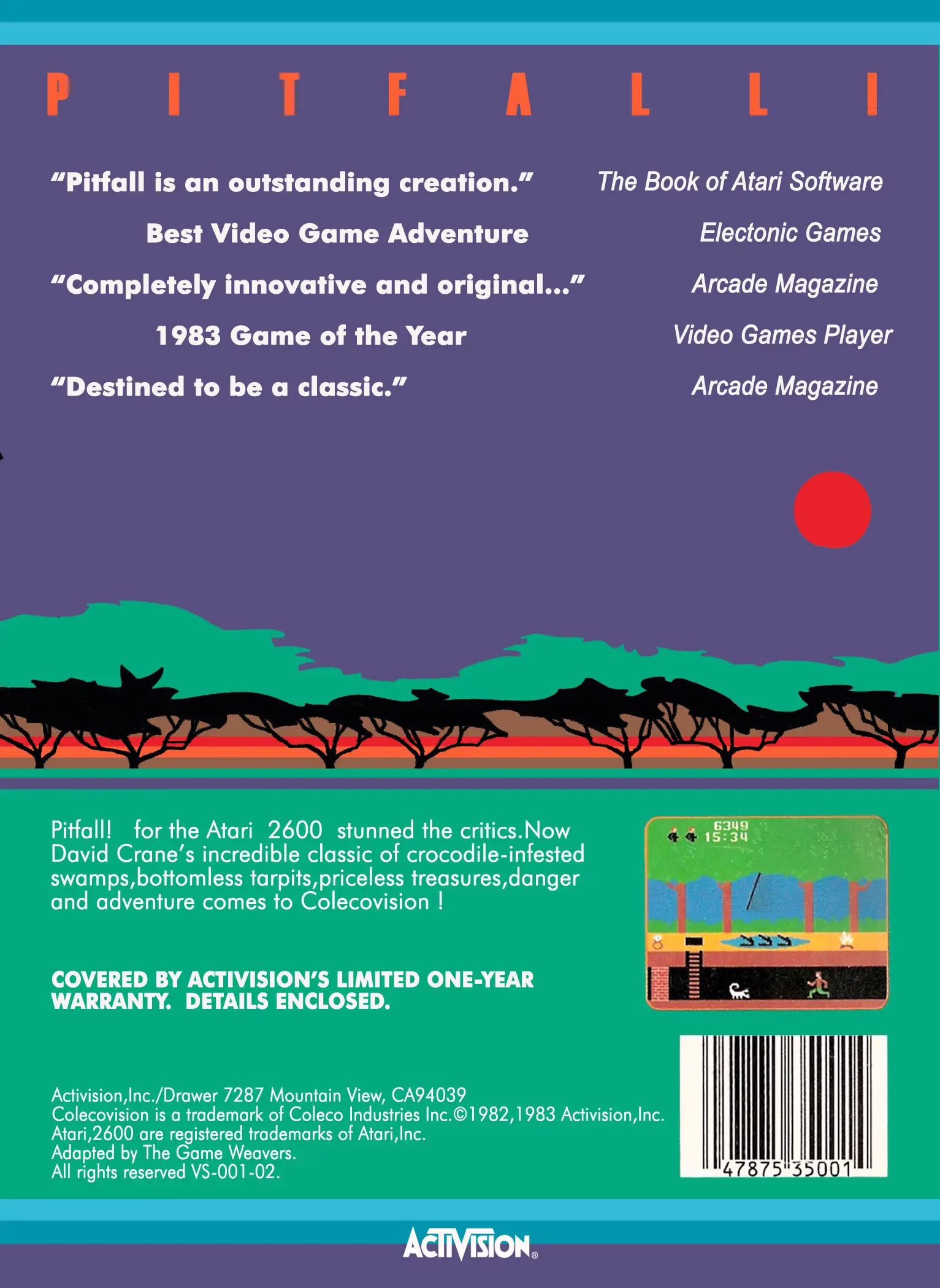 The player must maneuver a character known as Pitfall Harry through a maze-like jungle in an attempt to recover 32 treasures in a 20-minute time period. Along the way, he must negotiate numerous hazards, including pits, quicksand, rolling logs, fire, rattlesnakes, scorpions, and crocodiles. Harry may jump over or otherwise avoid these obstacles by climbing, running, or swinging on a vine to avoid them. Treasure includes gold and silver bars, diamond rings, and bags of money. Under the jungle there is a tunnel which Harry can access through ladders found at various places. This is required to get around some surface areas that have no way across otherwise. The tunnels are filled with dead-ends blocked by brick walls, forcing the player return to the surface at one of the ladders, and try to find a way around again. The tunnels also contain treasure and scorpions Harry must jump over.