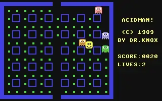 A game based on Pac-Man by Markt & Technik and released in 64'er Sonderheft 49. Collect the little green dots while avoiding the ghosts. However, this differs from Pac-Man in that there are NO power pills, so you cannot actually kill the ghosts, instead you have to survive and advance to the following level by avoiding the ghosts until all the green dots are collected on the screen.