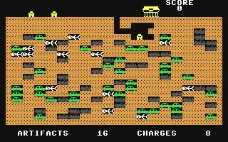 Points are earned by bringing dug-up artifacts to the ship; each droid is equipped with ten power charges, allowing it to move and blast through the dirt. Trouble is, a chargeless droid will quickly self-destruct unless it recharges back at the ship – plus, cave-ins may block up the tunnels and even destroy the poor droid. A deceased droid's remains (and its collected artifacts) can be picked up by its successor. Your objective is to plan your excavations carefully, avoid getting trapped, and receive the maximum score for your findings.