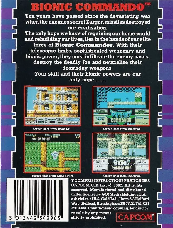 Combined with an arsenal of rapid-fire, armor-piercing and heat-seeking weaponry, this will put the power of an entire army in the hands of one man… one carefully chosen soldier, who has what it takes to become a new breed of unstoppable commando… a Bionic Commando. And you are that soldier! Your mission will take you through the heavily-patrolled wilderness surrounding the enemy headquarters and into the very heart of the fortress itself. Even to the most courageous soldier, it would seem an impossible challenge. But there has never been a soldier like the Bionic Commando!
