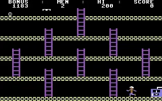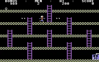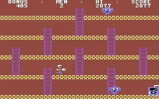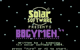 You are being haunted by Bogymen and the only way to keep them at bay is to keep the lights on but the problem is the meter is running out and so the lights are out and the Bogymen are wandering around. Bogy Men is a single screen platform game where you start in the bottom right of the screen with the meter and you have to climb ladders to get to the top left where a coin is within a time limit. The Bogy Men cannot be seen except for their eyes as they wander around the screen and if you touch one then you lose one of three lives. There is enough power in the meter to flash the lights on and off for a brief moment three times to stun the Bogy Men for a few seconds. Once the coin is collected then you have to get back down to the meter and once the meter is reached then the lights come back on and now you can see the Bogy Men as well as a trident. If you collect the trident then you can chase the Bogy men and destroy them and once all have been destroyed then you move to the next level.