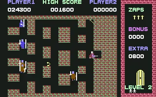 The princess is being held captive inside the castle, and it’s up to you (the knight) to rescue her. In order to do this, though, you need to collect the door pieces that are scattered in the six dungeons that await you, and defeat the black wizard in the end. Time is against you, so you need to hurry up. Once you have collected all pieces, the exit door will open, and you can proceed to the next dungeons. Collect other items for bonus points and avoid other knights that will shoot at you, even when their backs are turned. To make it fair, you can shoot them. Some knights only take one hit to kill, others may take more.