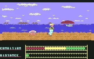 In Crazy Jogger, a Multisoft game by Jörg Tuttas you run along the beach avoiding all the wildlife there by jumping and ducking and see if you have what it takes to go the full distance. When you get to the end of the beach path, as noted by the distance marker, you go to the next level. In the bonus levels between each jogging level, you must try to catch the falling drinks and other items. Then on to the forest where creepy crawlies, porcupines and forest birds try to catch you. The nighttime level has crows, bats and bullfrogs to avoid, along with the other creatures.