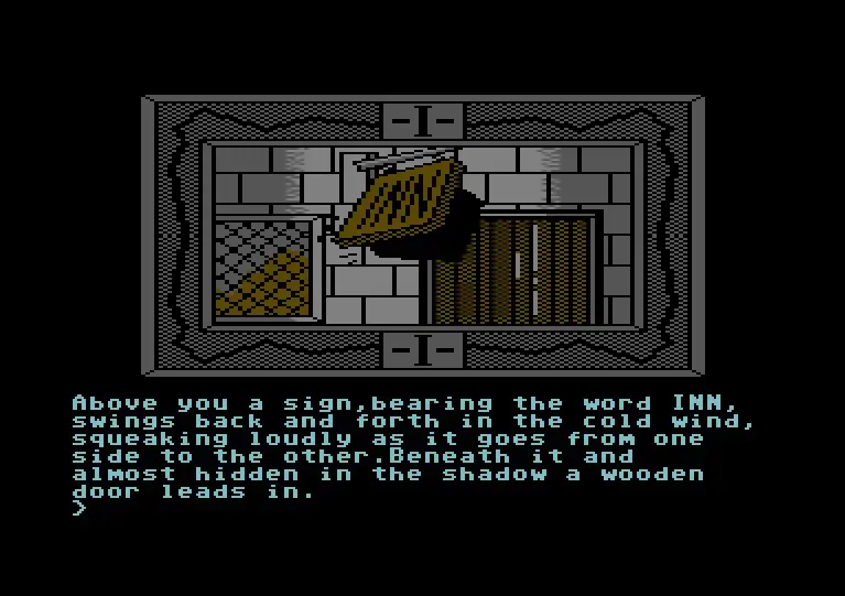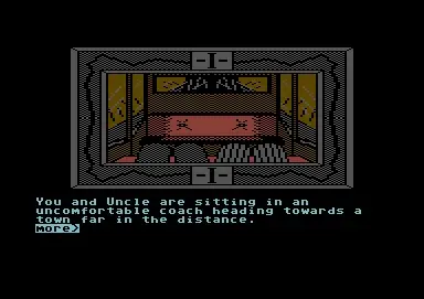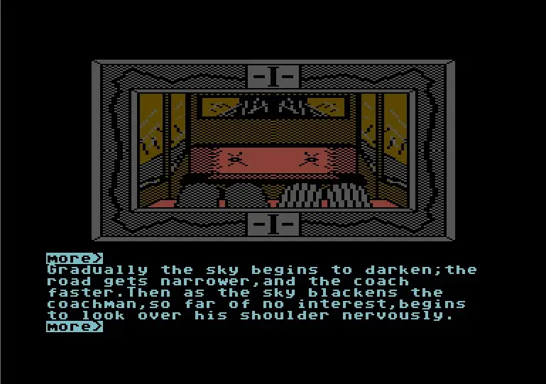 Dance of the Vampires is an adventure game split into three chapters. The screen consist of the picture of the location that players are presently at, a description of that location, and a prompt where commands are entered. Recognizable commands include EXAMINE, TAKE, DRINK, ASK ABOUT.
