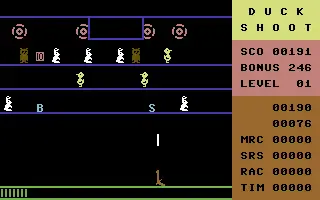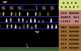 Duck Shoot brings you all the fun of the fair on a shooting range as you try to remove six plates at the top of the screen with your gun at the bottom of the screen which moves left or right. Above your gun are four rows with various items that either move left to right or right to left and you must remove all six plates to move to the next level. All the other items can be shot for bonus points but occasionally ducks will fly down and if they reach the bottom of the screen they will eat your bullets which are limited and shown on a bar below your gun. A duck will also fly across the top of the screen and if it reaches the other side of the screen then any plates shot will reappear. It is game over once you have run out of bullets.