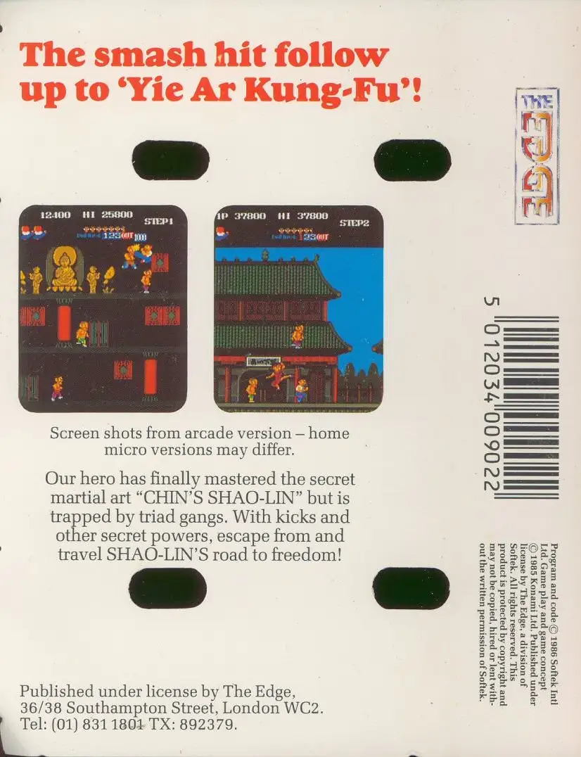 The arcade follow-up to Yie Ar Kung Fu switches from the one-on-one style into a platform beat ’em up design. You play Lee, who has become trapped in the Temple by the Triads, and must escape by over-powering them. Each section of the game is on several levels (which you can jump up and down) and scrolls. Balls of energy are sometimes released when you kill a Triad – grab this and it becomes a powerful weapon you can hurl at an opponent. Most enemies can be killed with standard kicks, but each level has a Super Triad who can only be killed through magic.