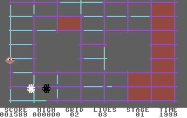 Gridder is a single screen game played over an 8 x 8 grid where you control a head and you have to fill in all the boxes to complete a level. As you move around the grid you paint the lines and when a box has been surrounded then it fills in. Scorpions also move around the screen and they must be avoided because if you touch one then you lose one of three lives. If you complete a level before the timer reaches zero then you receive bonus points.
