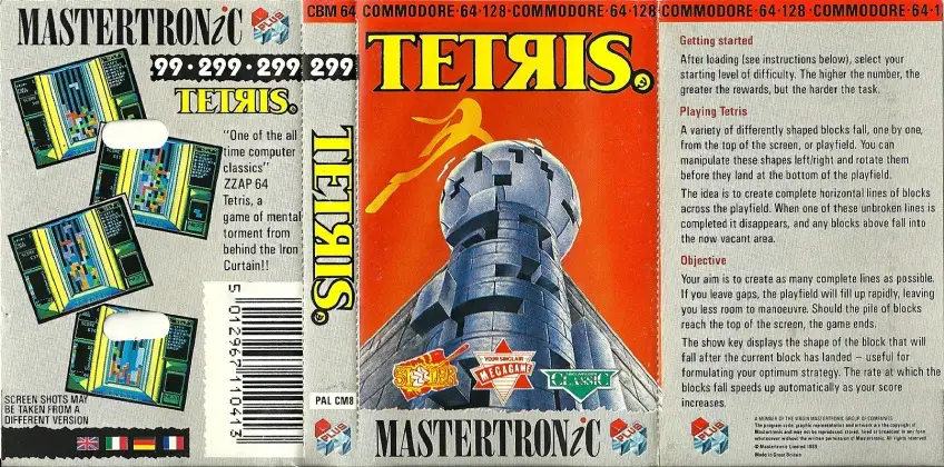 The original commercially-licensed version of Alexey Pajitnov’s classic Tetris puzzle game. Geometric shapes fall from the top of a playfield to rest on the bottom; fit the pieces together, and the line they form disappears. If the pieces don’t form lines and eventually stack up to the top of the playfield, the game is over. Difficulty increases by dropping the pieces faster and faster over time.