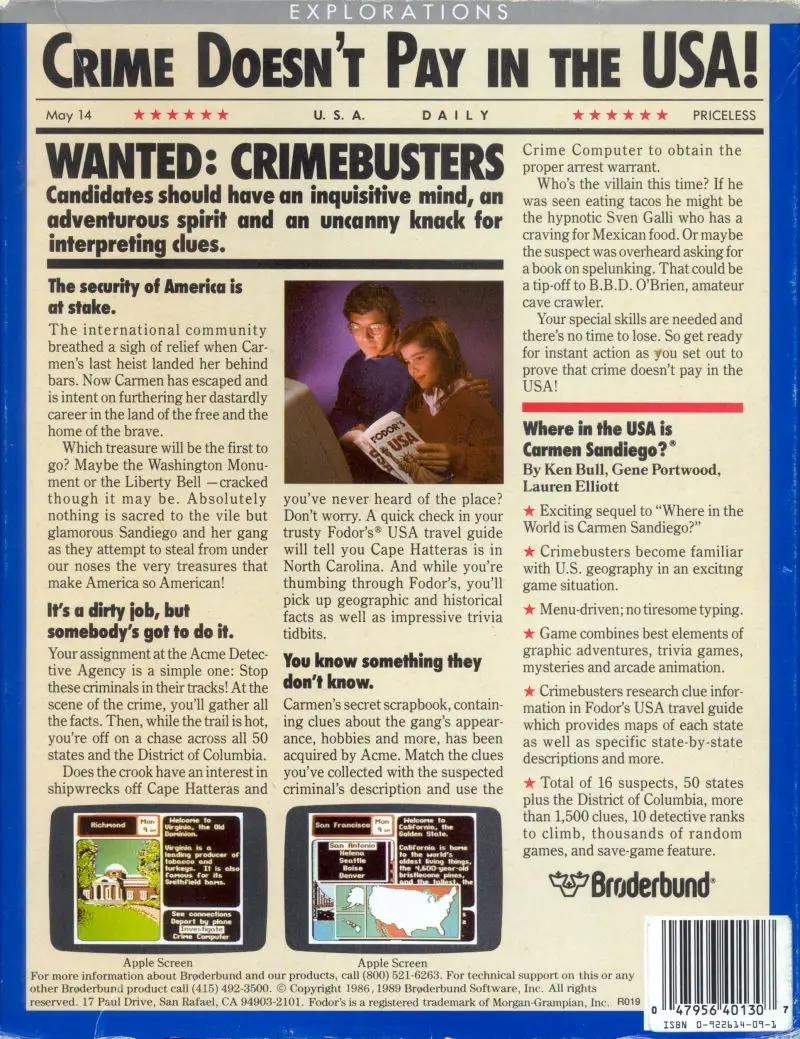 As a detective, the player must hunt down Carmen Sandiego's henchmen, who have stolen outrageous items that are important in US history and heritage. Using clues, the player will follow the henchmen from city to city.