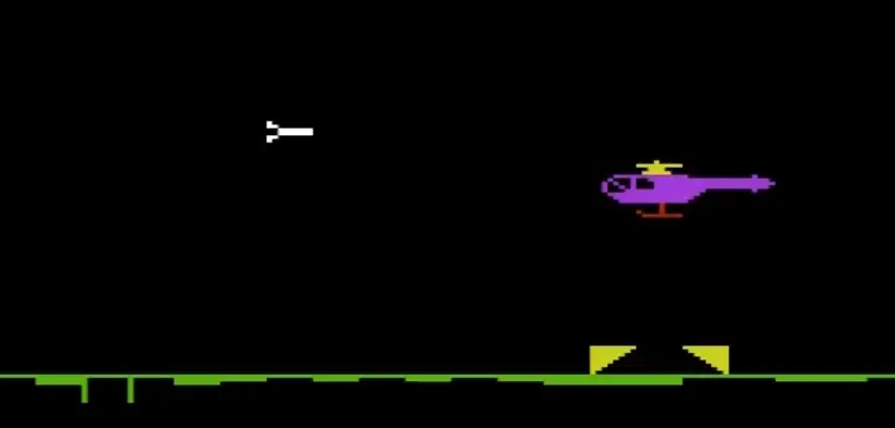 In Phase 2, the enemy begins to drop parachute mines directly onto your supply lines. The player controls a gun that moves laterally at the bottom of the screen. You must protect your helicopter's fueling by shooting the incoming mines. Each missed mine costs 5 fuel, and if all fuel is lost or the gun is hit by a mine it's game over.