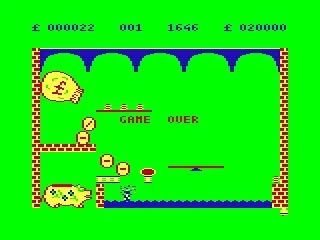 Coins pour out of a money bag at the top left of the screen, and the player's goal is to direct the bouncing coins into the piggy bank. The player moves a small control hand on the screen that can be used to manipulate the movement direction of coins. Springs bounce coins around, and dollars fall from the sky and land on platforms, and if a coin hits a dollar sign it is destroyed. If a coin falls into the water at the bottom of the screen it is also destroyed. As coins are collected or destroyed, the coin counter at the bottom of the screen goes up or down. If the counter fills up before time runs out, then the player moves to the next level. If the counter hits 0 it's game over.