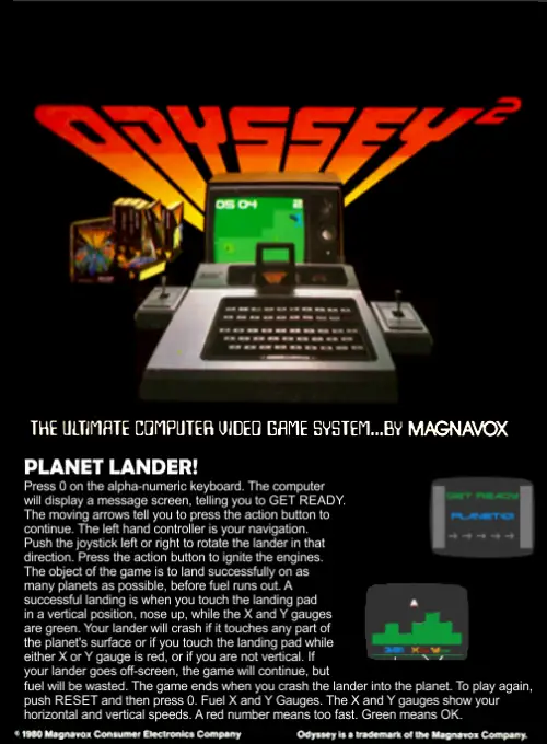 The object of the game is to land successfully on as many planets as possible, before fuel runs out. A successful landing is when you touch the landing pad in a vertical position, nose up, while the X and Y gauges are green.