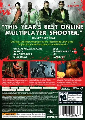 Left 4 Dead is a 2008 first-person shooter game developed by Valve South and published by Valve. It was originally released for Microsoft Windows and Xbox 360 in November 2008 and for Mac OS X in October 2010, and is the first title in the Left 4 Dead series. Set during the aftermath of a zombie outbreak on the East Coast of the United States, the game pits its four protagonists, dubbed the “Survivors”, against hordes of the infected.