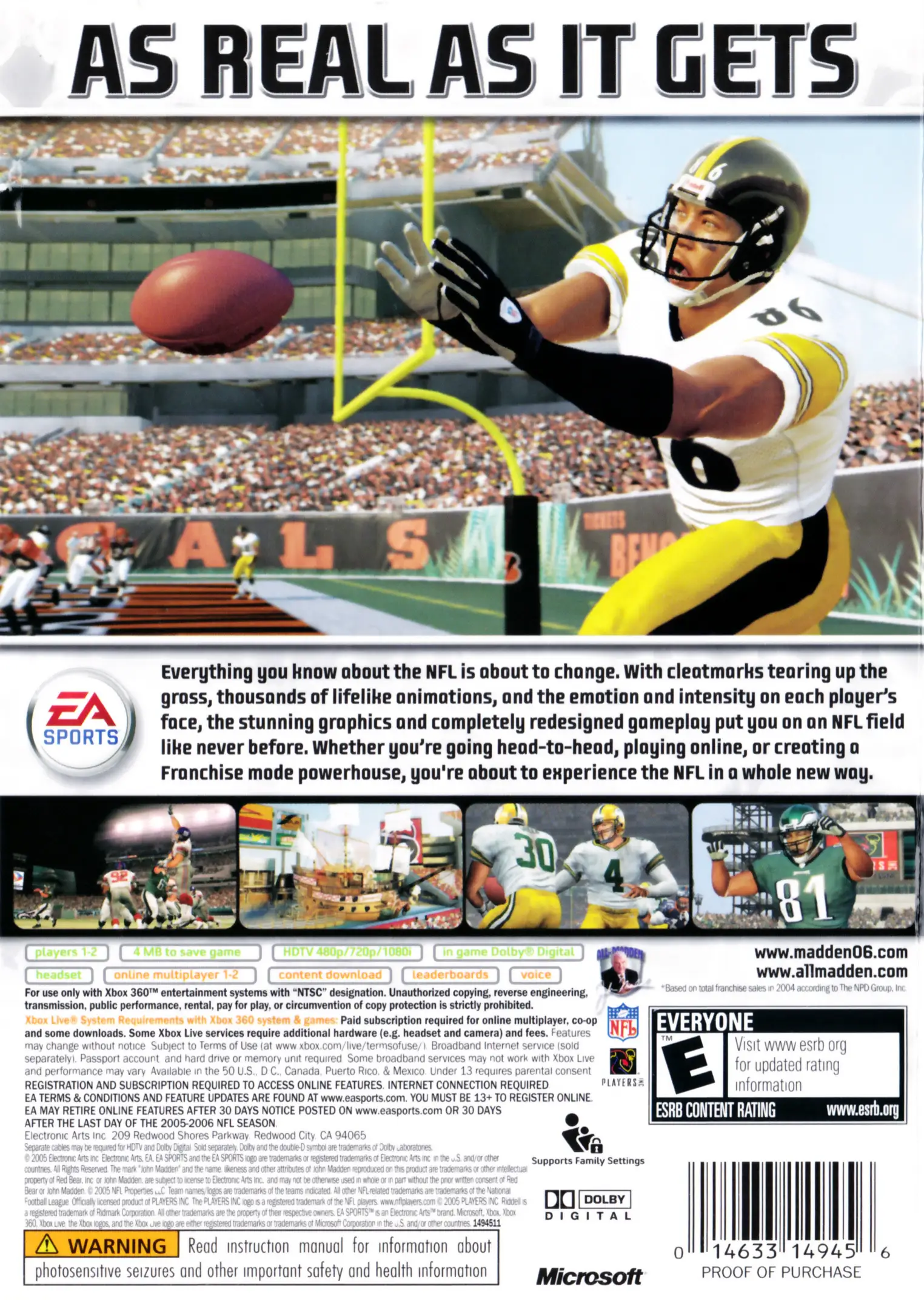 Everything you know about the NFL is about to change. With cleat marks tearing up the grass, thousands of life-like animations, and the emotion and intensity on each player’s face, the stunning graphics and completely redesigned gameplay put you on an NFL field like never before. Whether you’re going head-to-head, playing online, or creating a Franchise mode powerhouse, you’re about to experience the NFL in a whole new way.