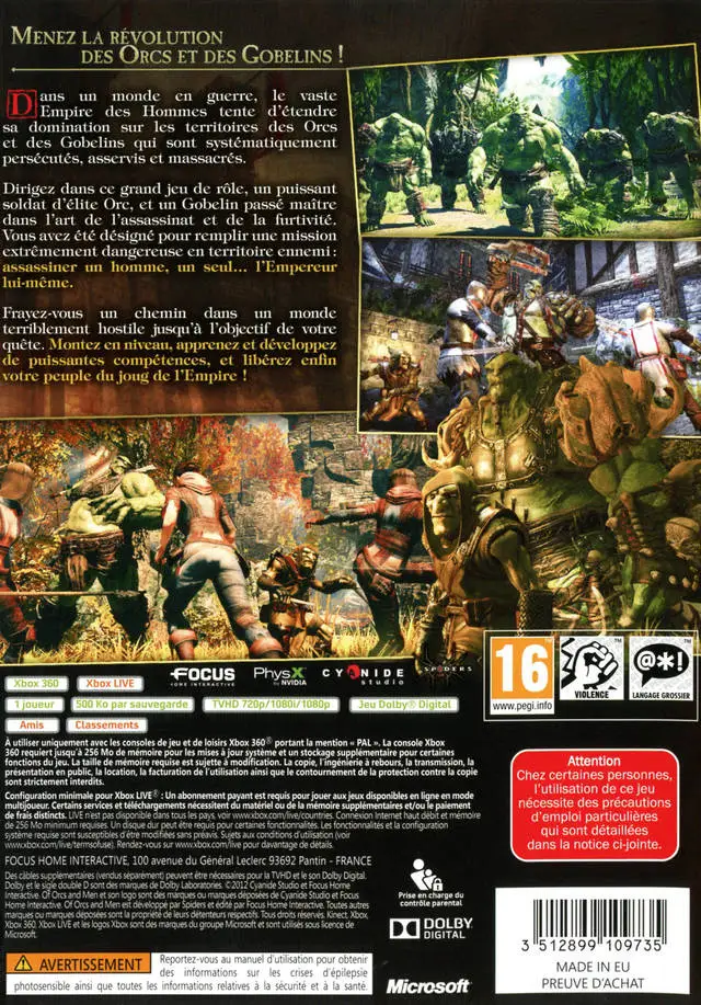 Of Orcs and Men is a fantasy action role-playing game developed by Cyanide and Spiders for PlayStation 3, Xbox 360 and PC.[2] The Empire of Men’s oppressive threat looms over the territories of the Orcs and the Goblins. Goblins are systematically persecuted and slaughtered, while Orcs not killed in battle are captured and enslaved or killed.