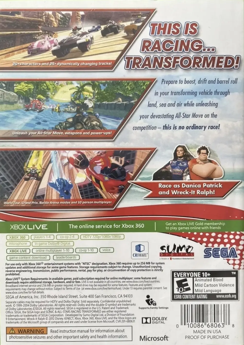 Sonic & All-Stars Racing Transformed is a kart racing video game developed by Sumo Digital and published by Sega. It was released for the PlayStation 3, Xbox 360, and Wii U in November 2012, for PlayStation Vita in December 2012,[9] for Microsoft Windows in January 2013,[7] for Nintendo 3DS in February 2013, and for iOS and Android in January 2014.[8][10][11] The PS3 and Wii U versions of the game were released in Japan on May 15, 2014.[12]