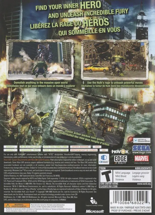 Fast-paced and action-packed, the blockbuster franchise and comic book saga unfolds for the first time on next-generation platforms, as Banner scours the planet trying to find anything to help him fight his involuntary rage. Take the role of one of Marvel's most powerful Super Heroes in The Incredible Hulk, a third-person action video game. Gamers can demolish anything in their path, including lampposts, passing cars and even buildings. The fury-fueled game also features key moments from the film, as well as additional plotlines and characters from The Incredible Hulk universe. Players crash through New York City, battling gigantic enemies amidst soaring skyscrapers in a massive open world.
