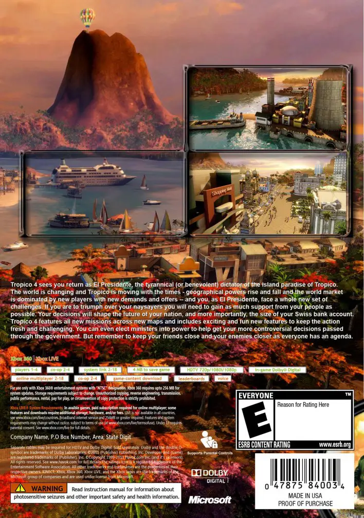 Tropico 4 is a video game developed by Haemimont Games and published by Kalypso Media. It is a construction and management simulation video game, which focuses on a city-building simulation. Like the first and third games in the series, it centers on a customizable main character titled “El Presidente” – the dictator who runs the island banana republic. The Mac OS X version of the game (Tropico 4: Gold Edition, containing the Modern Times expansion pack) was released by Feral Interactive on July 25, 2013,[1] as well as DLC packs Dash for Growth and Captain of Industry. DLC pack State of Emergency was released by Feral on April 3, 2014.[2]