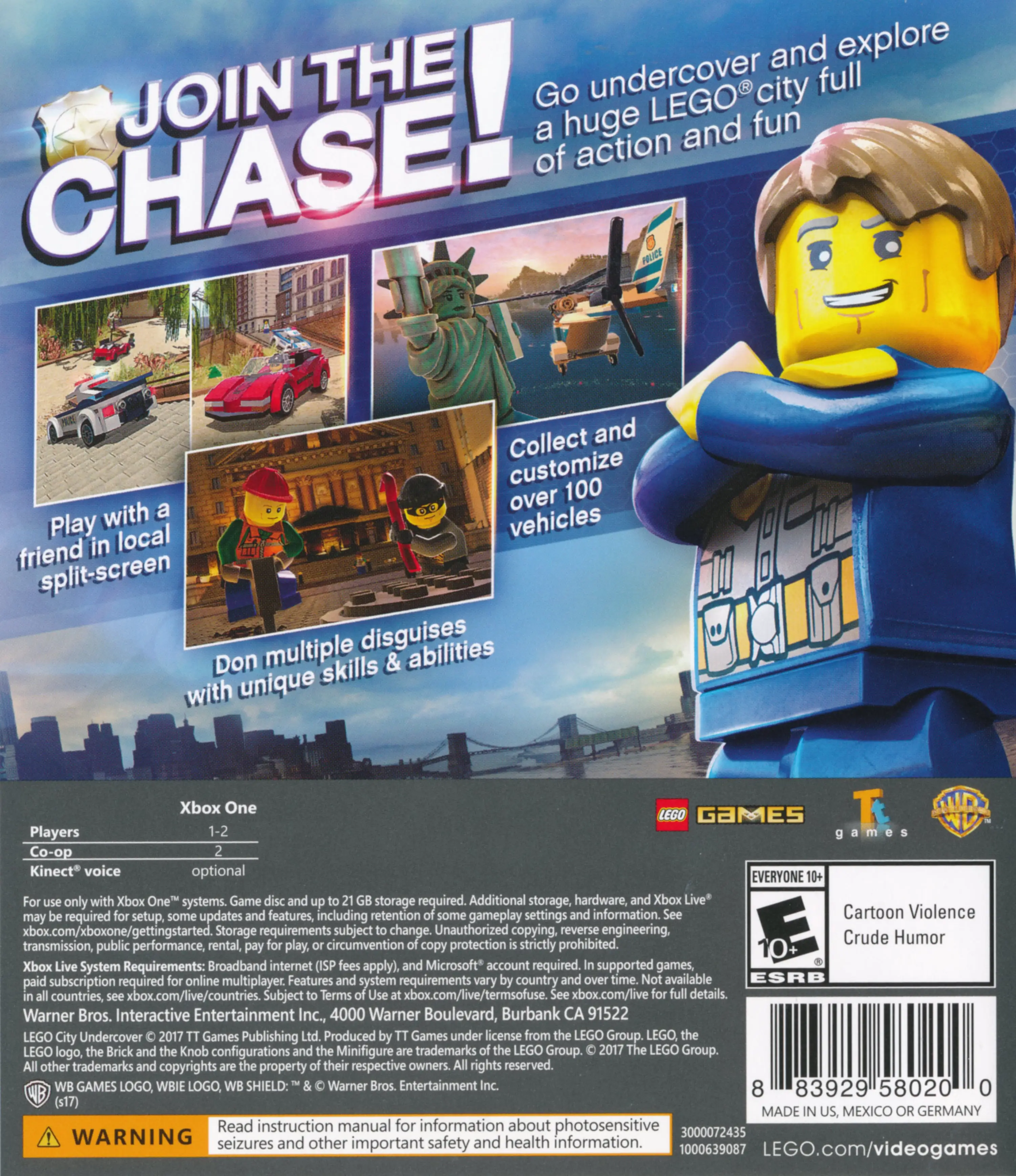 Join the Chase! In LEGO CITY Undercover, play as Chase McCain, a police officer who's been tasked with going undercover to hunt down the notorious – and recently escaped – criminal Rex Fury and putting an end to his city-wide crime wave. With two player co-op, friends can explore the sprawling open-world metropolis that is LEGO City, with more than 20 unique districts to investigate, car thieves to bust, hilarious movie references to discover, vehicles to drive, and hundreds of collectibles. LEGO CITY Undercover brings together witty, original storytelling with signature LEGO humor to create a fun-filled experience for players of all ages to enjoy.