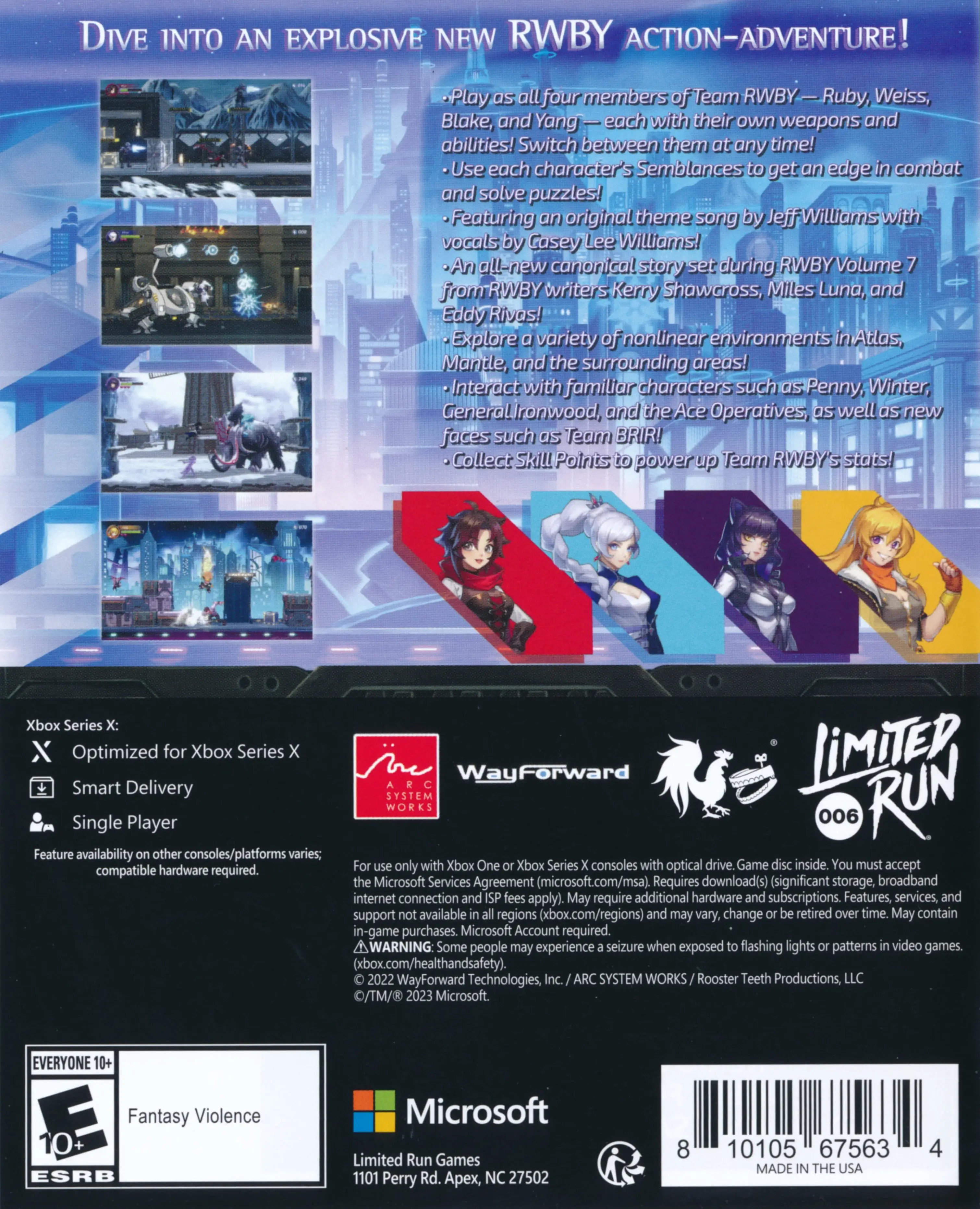 Dive into an explosive new RWBY action-adventure! Instantly switch between all four members of Team RWBY — Ruby Rose, Weiss Schnee, Blake Belladonna, and Yang Xiao Long — and use their signature weapons and Semblances to battle the Creatures of Grimm and other foes in this in-canon story set during RWBY Volume 7. Featuring voiceovers from RWBY's original cast, all-new cutscenes from the team behind the show, and a brand-new theme song by Jeff Williams and Casey Lee Williams, RWBY: Arrowfell lets you explore Atlas and the surrounding areas to solve environmental puzzles, slay massive bosses, power up with Skill Points, and interact with characters such as Penny, Winter, and General Ironwood, as well as the enigmatic new team of Huntresses, Team BRIR! Only Team RWBY can protect Remnant from a mysterious new threat in RWBY: Arrowfell!
