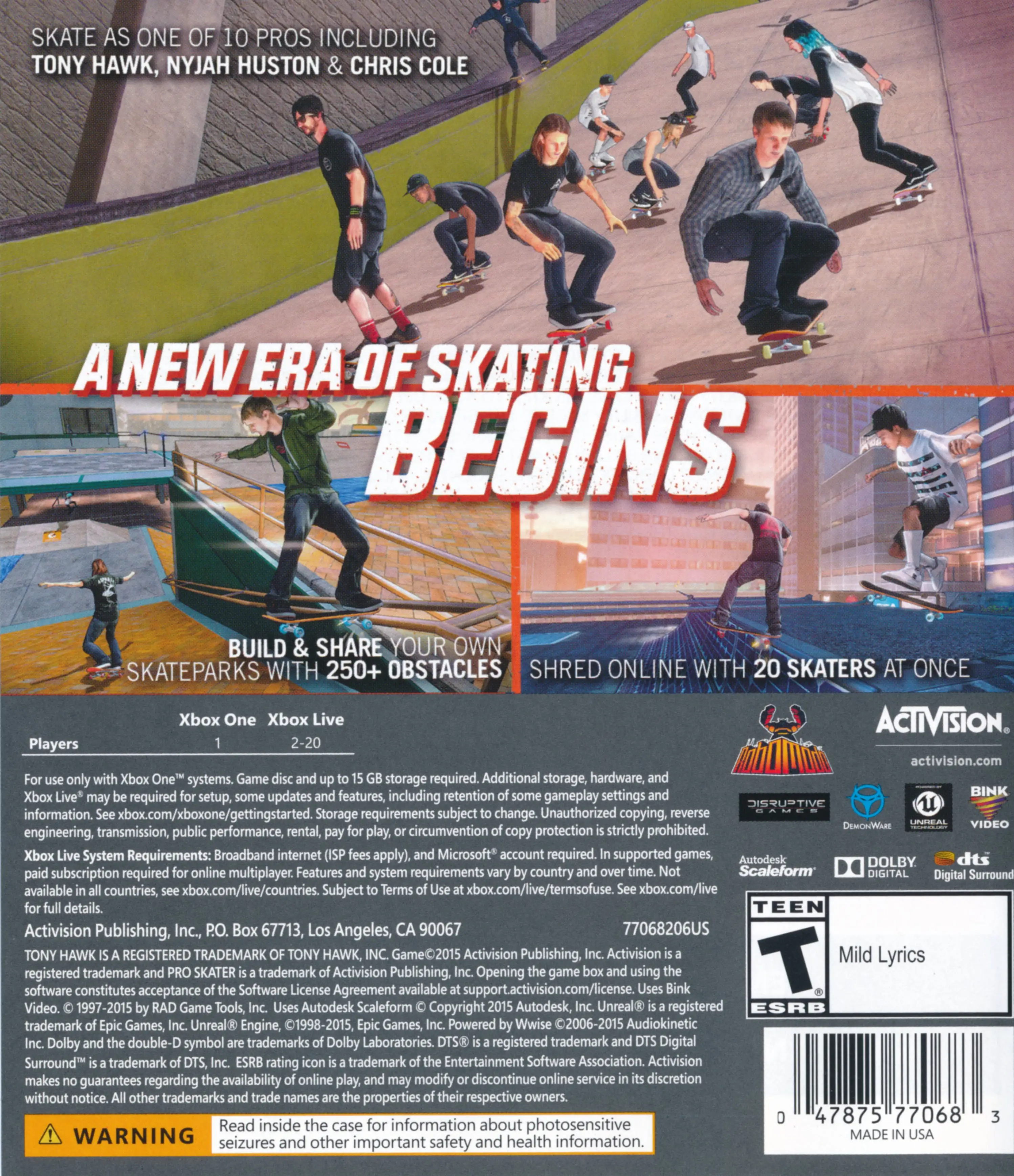 Tony Hawk's Pro Skater 5 is a skateboarding video game in the Tony Hawk's series developed by Robomodo and Disruptive Games, and published by Activision.[7] The game is the tenth game in the series, being the first main entry in the series since 2007's Proving Ground. The game was released on PlayStation 4 and Xbox One on September 29, 2015 and was critically panned. Patches have since been released to fix the game and add new content. The PlayStation 3 and Xbox 360 versions were released on December 15, 2015 in North America and Europe, after they were delayed to improve the original versions.