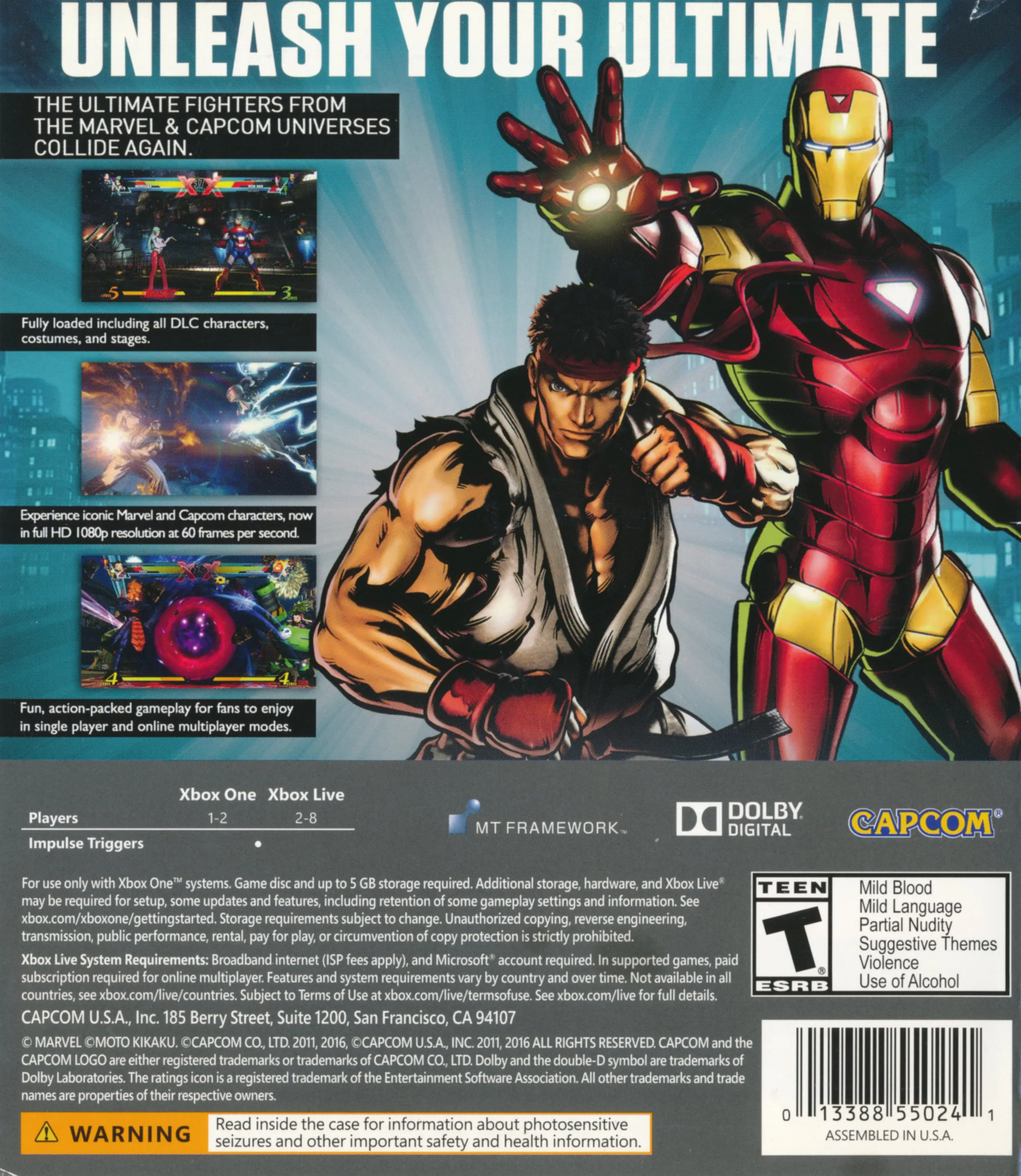 Marvel and Capcom join forces to deliver the most frenetic 3 vs. 3 tag battles ever with Ultimate Marvel vs. Capcom 3. This release comes fully loaded, including all previous DLC, Marvel vs. Capcom: Official Complete Works, and boasting full HD 1080p resolution at 60 frames per second. Select some of the most iconic Marvel and Capcom characters, and customize your team with “Heroes and Heralds” mode. Once you've honed your skills, hop online and go head-to-head against players from around the world to see who is the strongest in the universe.